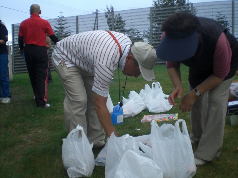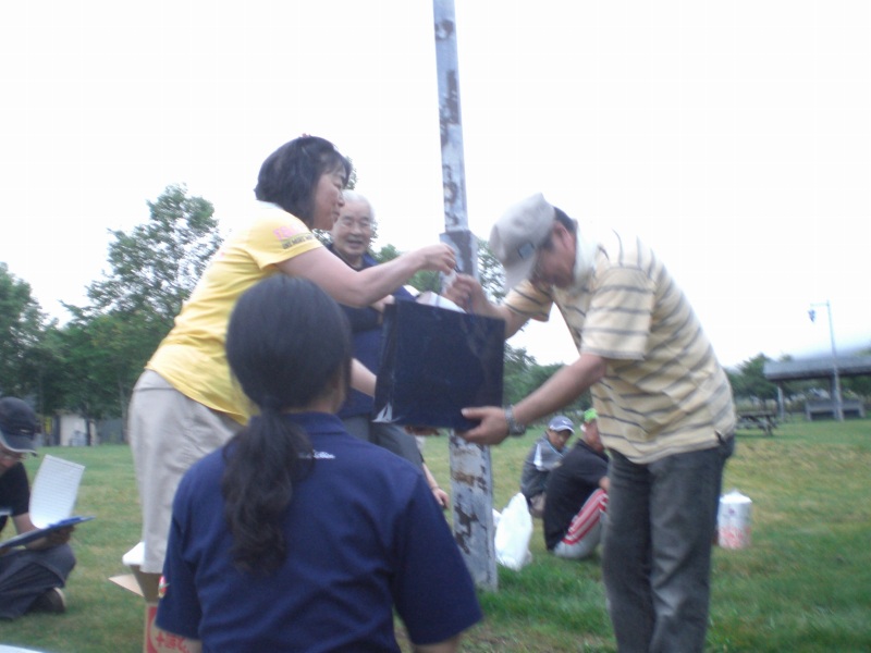 この日はとっても良いお天気!! パーク日和!と言うには暑すぎるほど・・・ それでもやっぱり、青空の下でプレーするのは気持ちが良いものです。 交流会は午後からでしたが、午前中には「つべつスポーツクラブ設立準備委員会」の委員の皆さんが、らいずの視察にいらっしゃいました。 体育館でお話をさせて頂いた後、パーク場にも足を運んで頂き、開会式の雰囲気を覗いて頂きました。 つべつスポーツクラブ設立準備委員の皆さん。 なんと!「賞品に使って下さい!」と、無農薬の玉ねぎをたくさん頂いちゃいました!! これには参加者の皆さんも大喜び!!!! つべつの皆さん、本当にありがとうございました。 さて、開会式も終わり、いよいよプレー開始! ほっかぶり姿で、茶々を入れたり・・・ 思いがけない打球にずっこけたり・・・ 素晴らしいプレーに見とれたり・・・ 産まれて初めてのパークゴルフに感動し、すぐ購入した 『myクラブ』の使い心地をしっかりと確かめたり・・・ みなさん、思い思いに楽しんでいらっしゃいました。 いい汗をかいたあとには、焼肉懇親会。 今回は、運営委員さん達からたーーーくさんの差し入れも頂き、 とっても豪勢な懇親会となりました。 そして表彰式。 賞品を選ぶ姿は真剣そのもの・・・ 更に、くじ引きで特別賞も! 会員さん、運営委員さんから合計10本! つべつの皆さんから頂いた玉ねぎも6名の方に当たりました!! 1/2の確率なのに、何も当たらなかったなぁ・・・ ![]() 秋晴れの1日。とても楽しい時間でした。 皆さん、お疲れさまでした。 PR