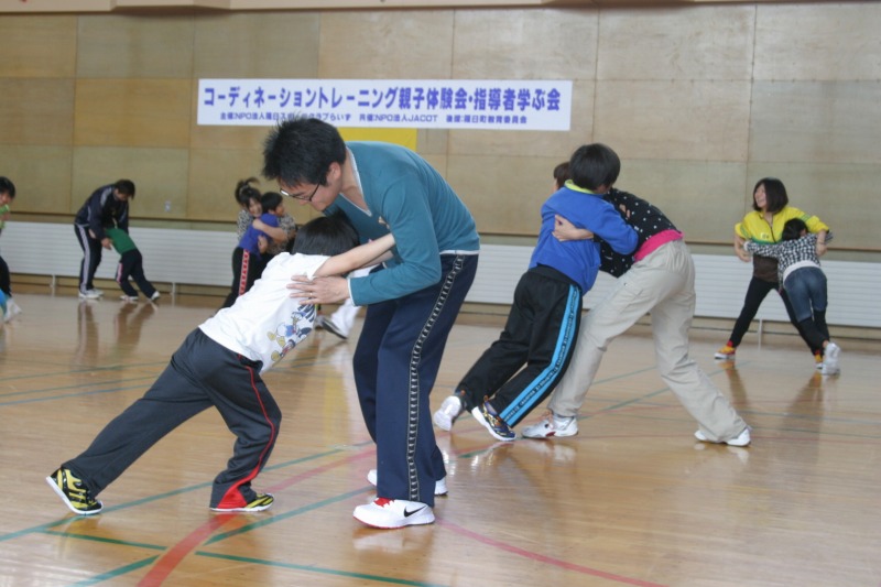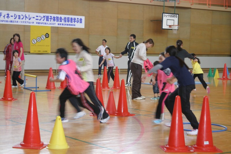 『コーディネーショントレーニング親子体験会&学ぶ会』を開催しました。 午前中は親子体験会。 16名の子どもたちと14名の保護者の皆さんが参加して下さいました。 親子で向かい合いながら、鏡のように動いてみたり 相撲をとる格好になってみたり・・・ これらの動きには全て意味があり、脳・神経系を刺激しながら動いたり、 また、骨盤の動きを意識してトレーニングする事で、子どもたちの身のこなしが変わってきます。 体験会の最後は『ジャングル鬼ごっこ』 体育館いっぱいに、コーンやハードル、フープなどをたくさん置いて、 そこはまるでジャングルのよう。 鬼から逃げるだけではなく、たくさんの障害物を避けながら鬼ごっこをします。 この頃、子どもたちの顔はもう真っ赤か。 普段、運動が苦手な子も、参加するのを渋っていた子も、 最後はとびっきりの笑顔。 体を動かすことの楽しさを、思う存分感じてくれたようです。 午後からは学ぶ会。 少年団活動に参加する6年生の女の子4人を含め、38名の参加がありました。 2時間に及ぶ講義の後、体育館で実技。 体をたっぷり動かして、COTの考え方や指導のポイントなどを学びました。 らいずでは、COTを通じて町民の皆さんが健康で明るく元気な毎日を送れるよう、お手伝いをしていきたいと思っています。 その第1弾として、小学校体育にお邪魔して、子どもたちにCOTを体験して頂く機会を持つこととなりました。 まだまだこれからですが、頑張ります!!