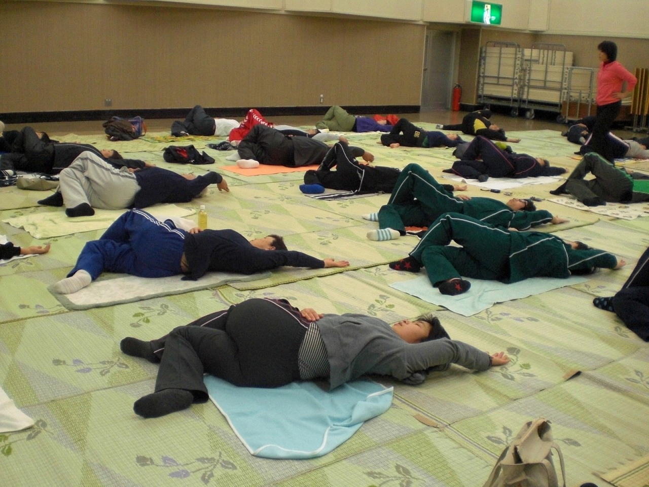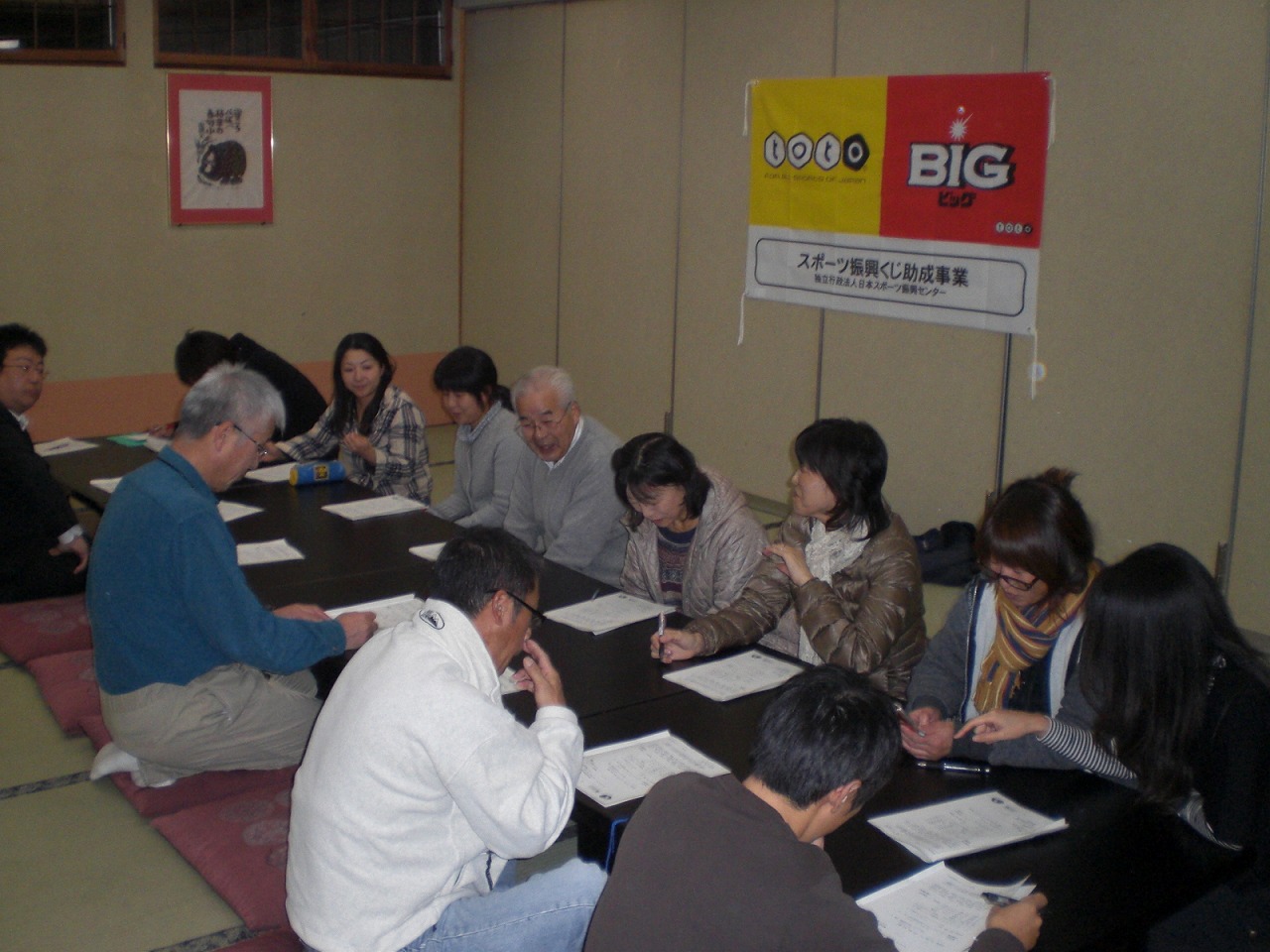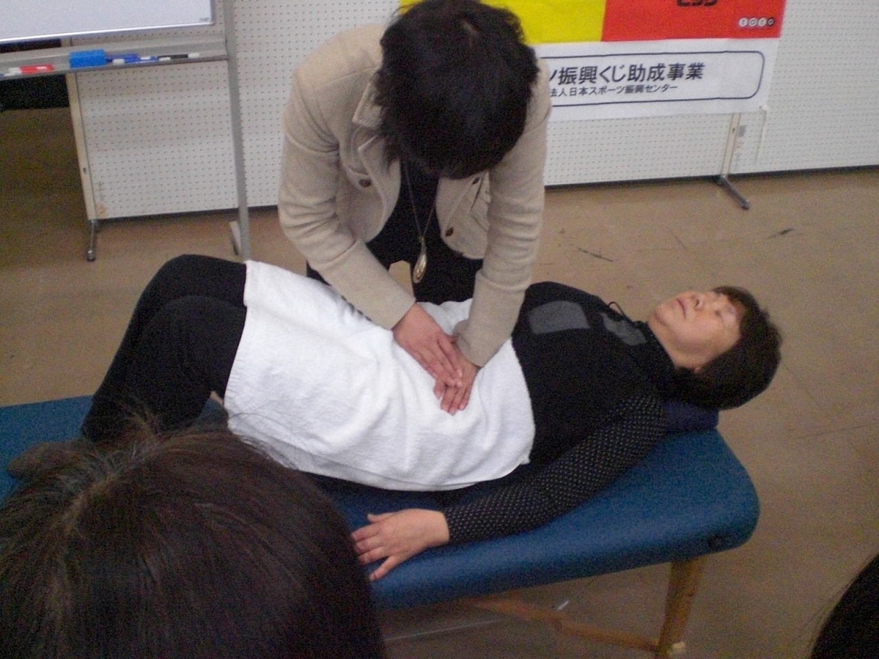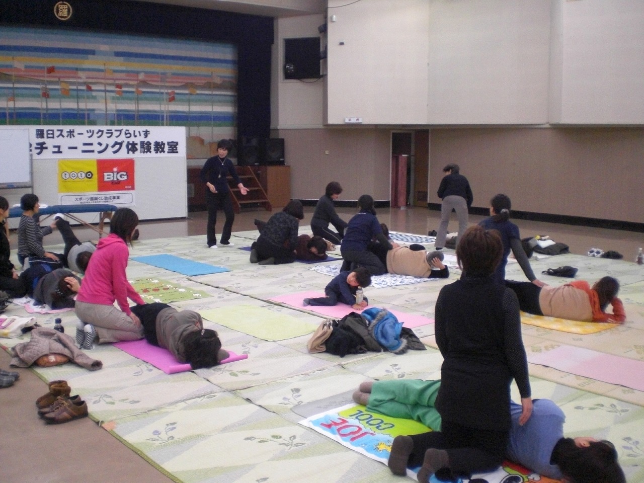下は小学2年生から。上は70代の方たちまで。 投げて決まれば、大盛り上がり ![]() ![]() いやー、ホントに楽しかったです。 審判をやっていても、充分に楽しめました。 らいずの皆さんのパワーったら、ホントにすごいですよ。 で、決勝戦は・・・ 予想を裏切らない、M一家と 今回初参加。フロアカーリングには自信ありのチームとっどるの皆さん。 たくさんの観客が見守る中、白熱した試合展開でした。 優勝したとっどるの皆さん。本当におめでとうございました。 で、7日(火)には『体幹チューニング体験教室』を開催しました。 一度体験した運営委員さん達が、『是非らいずでも!!』とプッシュして下さり、 講師の先生にも快諾して頂き実現しました。 『体幹』って、最近結構話題になっていますよね。 カラダの中心部を整えることで、血流が良くなったり、姿勢が良くなる。 よって、体調が良くなったり、運動時によりパワーを発揮できるようになったり、スタイルが良くなったり・・・ じゃあ、実際どんな事するの?っていう話ですが、 難しい事は一切なし。 簡単に言うと、『正しい呼吸法でちょっとした体操をする』んです。 まずは、モニターさんで先生が実際に手本を見せてくれました。 ポイントになるところを押しながら、腹式呼吸をしていきます。 すると、この方、実施前と後では姿勢が明らかに変わったんです!! 実際に私たちもやってみました。 まずは、二人ひと組でそれぞれの体の状態をチェックします。 立ったときの姿勢や、横になった時の体のバランスの状態などなど。。。 その後、それぞれ横になって先生の指導のもと、ポイントになるところを押しながら腹式呼吸をしていきます。 こんなポーズをしながら呼吸をしたりもします。 写真だけじゃ分かりにくいかもしれませんが・・・ ![]() 私の場合、実施前には体育座りをして少し後ろに傾いた時にコロンっと後ろに倒れて居たのが、この体操をした後に、ばっちり姿勢をキープ!! そして、ふくらはぎに痛みがあったのもすっかり良くなったんです!!! って、こういうのって聞いたりしただけじゃ、伝わらないのが悔しい!! でもでも、この教室。なんと56名もの方々が参加して下さるほどの盛況ぶり。(今年度のらいず事業で1番多いんです!) そして、多くの皆さんが、その違いを実感していって下さいました。 興味のある方は、いつでも事務所に遊びにいらして下さい。 私で良ければ、お伝えいたしますので。 講師の酒井先生、本当にありがとうございました。