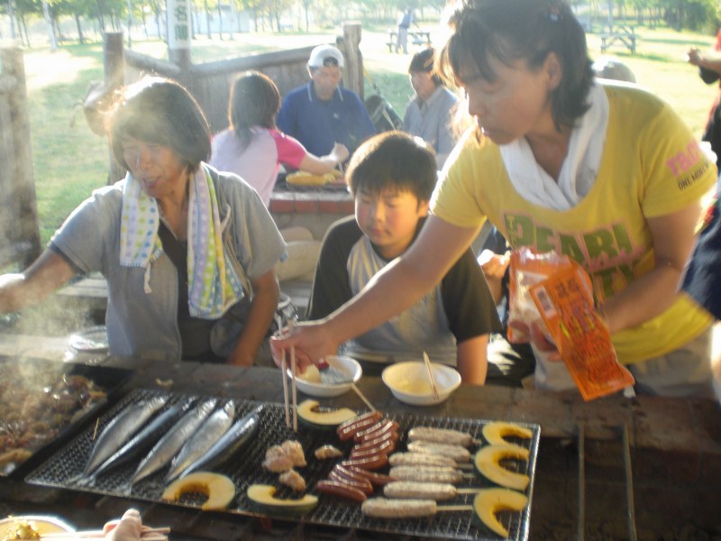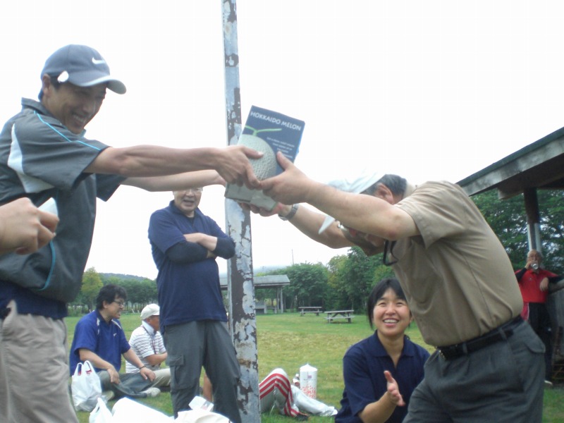 この日はとっても良いお天気!! パーク日和!と言うには暑すぎるほど・・・ それでもやっぱり、青空の下でプレーするのは気持ちが良いものです。 交流会は午後からでしたが、午前中には「つべつスポーツクラブ設立準備委員会」の委員の皆さんが、らいずの視察にいらっしゃいました。 体育館でお話をさせて頂いた後、パーク場にも足を運んで頂き、開会式の雰囲気を覗いて頂きました。 つべつスポーツクラブ設立準備委員の皆さん。 なんと!「賞品に使って下さい!」と、無農薬の玉ねぎをたくさん頂いちゃいました!! これには参加者の皆さんも大喜び!!!! つべつの皆さん、本当にありがとうございました。 さて、開会式も終わり、いよいよプレー開始! ほっかぶり姿で、茶々を入れたり・・・ 思いがけない打球にずっこけたり・・・ 素晴らしいプレーに見とれたり・・・ 産まれて初めてのパークゴルフに感動し、すぐ購入した 『myクラブ』の使い心地をしっかりと確かめたり・・・ みなさん、思い思いに楽しんでいらっしゃいました。 いい汗をかいたあとには、焼肉懇親会。 今回は、運営委員さん達からたーーーくさんの差し入れも頂き、 とっても豪勢な懇親会となりました。 そして表彰式。 賞品を選ぶ姿は真剣そのもの・・・ 更に、くじ引きで特別賞も! 会員さん、運営委員さんから合計10本! つべつの皆さんから頂いた玉ねぎも6名の方に当たりました!! 1/2の確率なのに、何も当たらなかったなぁ・・・ ![]() 秋晴れの1日。とても楽しい時間でした。 皆さん、お疲れさまでした。